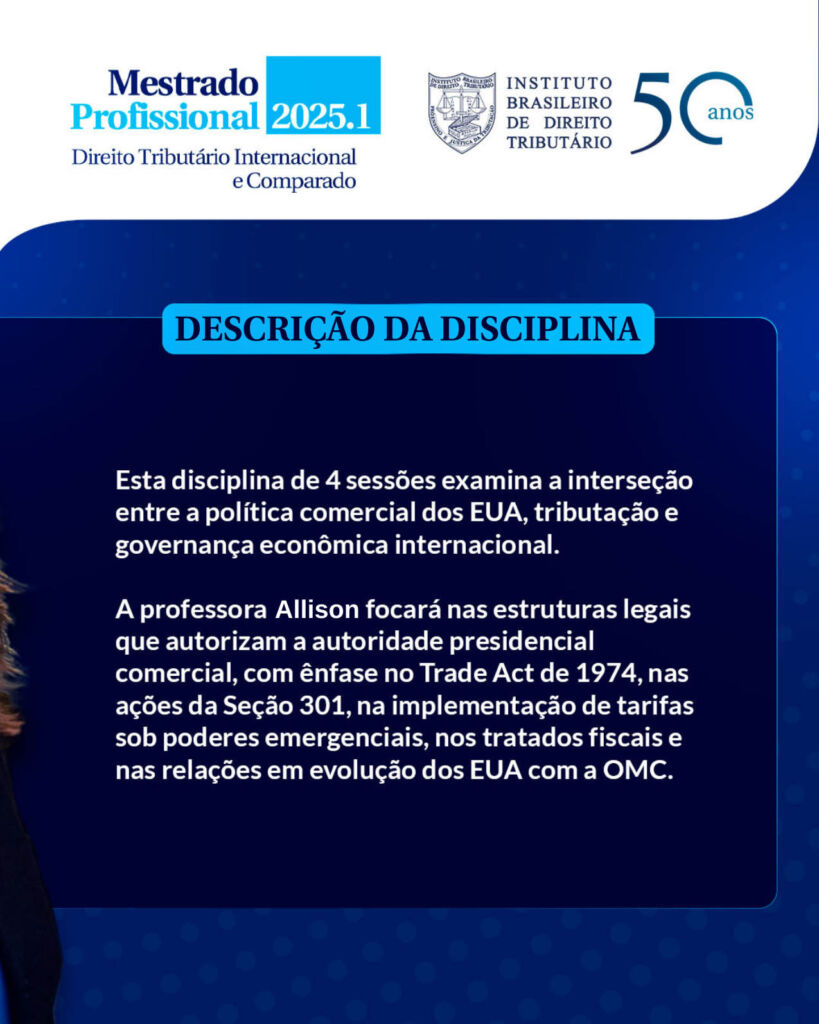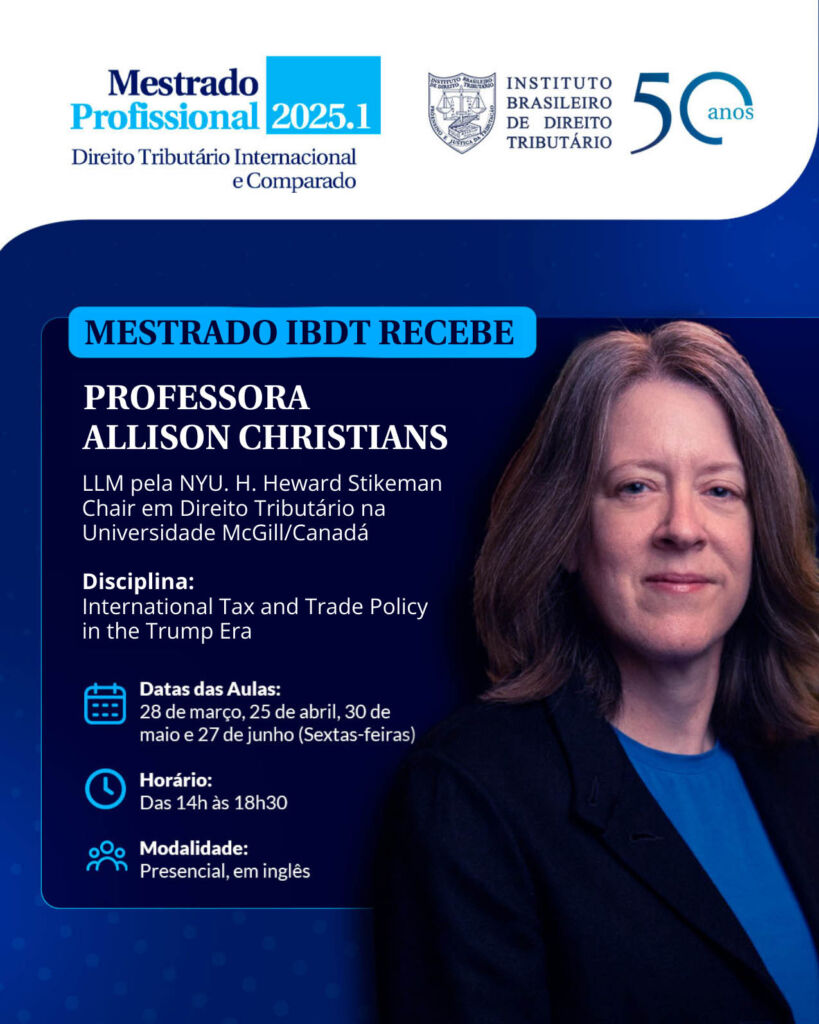 O Mestrado Profissional do IBDT tem a honra de receber a Professora Allison Christians, especialista internacional em Direito Tributário e Política Comercial, do Canadá, para ministrar a disciplina International Tax and Trade Policy in the Trump Era.