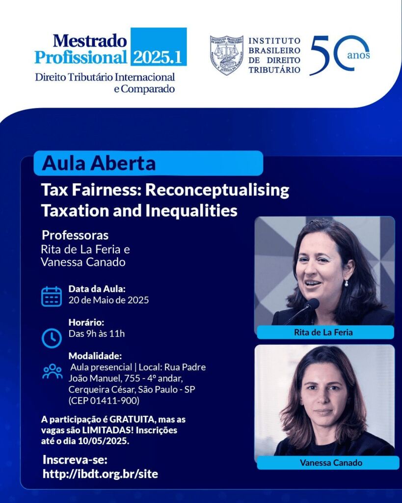 O Mestrado Profissional do IBDT tem a honra de receber as Professoras Rita de La Feria e Vanessa Rahal Canado para ministrar Tax Fairness: Reconceptualising and Inequalities.